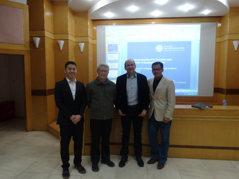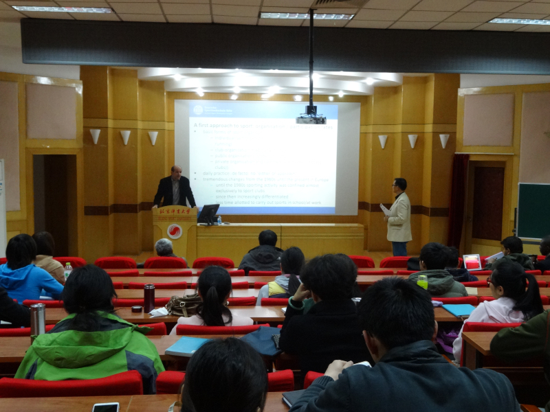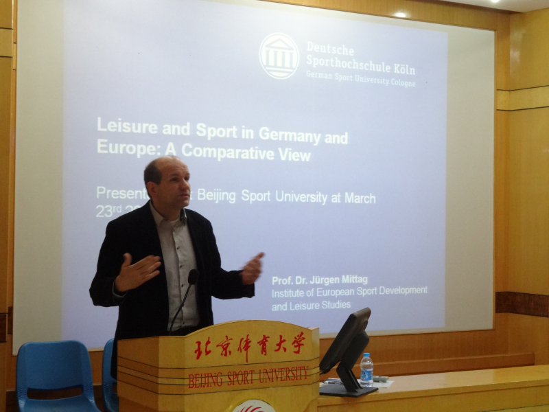 2015年3月23日,德国科隆体育大学欧洲体育发展与休闲研究学院院长于尔根·米塔格教授来我校进行访问授课。于尔根教授对体育和体育政策、欧洲一体化、政治运动和公民社会有着深入的研究,在欧洲乃至国际上都享有很高的知名度。