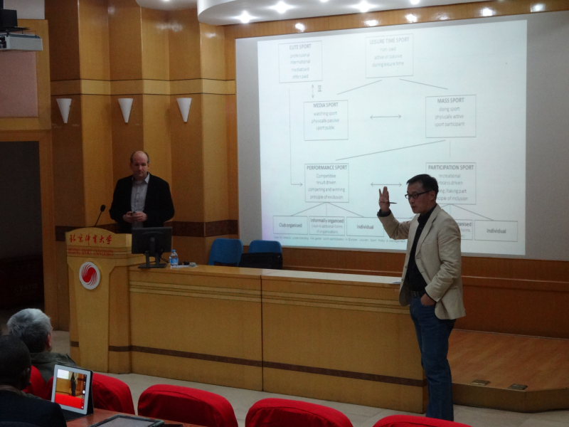 本次授课对象为体育人文社会学方向博士与高访学者,授课内容为欧盟成员国休闲和体育行为变化趋势比较研究。课程全程用英语授课,由外事处花勇民副处长在现场进行翻译。