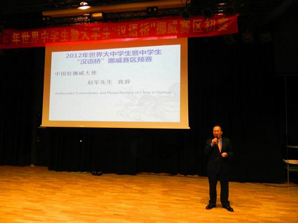在为选手颁奖之前,中国驻挪威大使赵军先生慷慨陈词,他强调指出本次“汉语