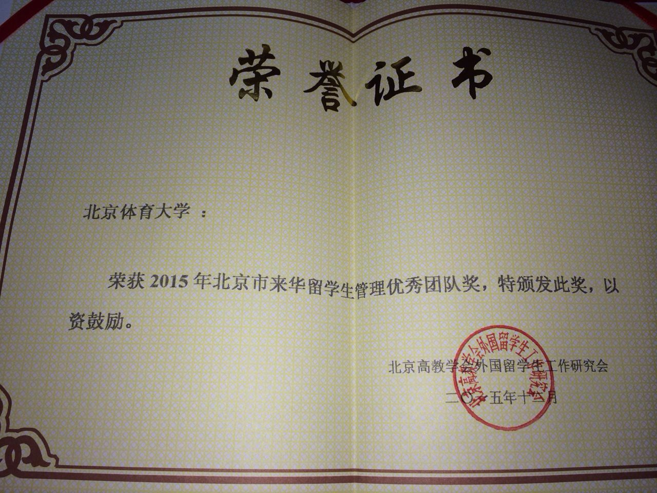 2026世界杯官网国际教育学院荣获“2015年度北京市来华留学生管理优秀团队奖”,评奖范围涉及北京市70余所招收来华留学生的高等院校,从留学生招生、教学管理、学生培养、签证护照管理、毕业就业及学生大型活动等多方面综合考评,此奖项是北京高教学会外国留学生工作研究会成立近30年来首次颁发的优秀团队奖,我校国际教育学院在全体老师的共同努力下获此殊荣;此外,我校国际教育学院张笑老师荣获“北京市来华留学生管理工作优秀干部·二等奖”,在此对学校荣获优秀团队和优秀个人获奖表示祝贺。