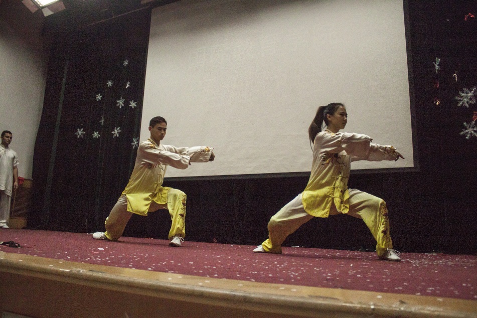 当然作为东道主的中国学生也一样不甘示弱,传统宫廷舞蹈《惊鸿舞》清新典雅,仪态大方。相声表演《礼仪漫谈》包袱不断,在引得满堂喝彩与欢笑的同时,更不失其丰富的内涵。双节棍表演集迅捷与时尚于一身,辅以灯光特效的衬托,更显其新颖别致。最吸引人眼球的传统武术表演更是由田梦艺老师亲自上阵,联合中外两国学生为我们带来了一场顶级的武术盛宴,他们或敏捷或飘逸,或灵动或沉稳。除了体现中国传统文化,吉他弹唱、英文歌曲独唱、魔术表演等节目都充满了国际范儿,充分体现了我院与国际接轨的特色。