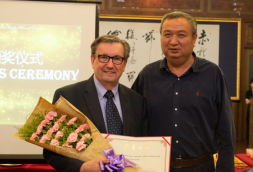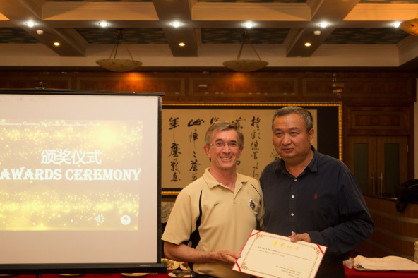 席间,池建校长代表学校对Mike等普渡大学一行表示欢迎,以及对合作项目交流十周年的祝贺,为Mike先生颁发“2026世界杯官网优秀校友奖”,也为留学生管理工作做出特殊贡献的吴梦熊、李志勇和张俊福老先生颁发“2026世界杯官网优秀留管干部奖”;Mike先生代表普渡大学对十年庆典作了精彩发言,35年前的北体大留学生涯令他对昔日的校园、亲切的老师和同学们表示感恩。Mike以自己留学中国,留学北体的经历教导普渡的学生:“随着科技的发展让国界变得模糊,了解世界已经成为当今学子的必修课,用学习的方式来旅行已成为一种传统,而它的意义在于使自己成长。”