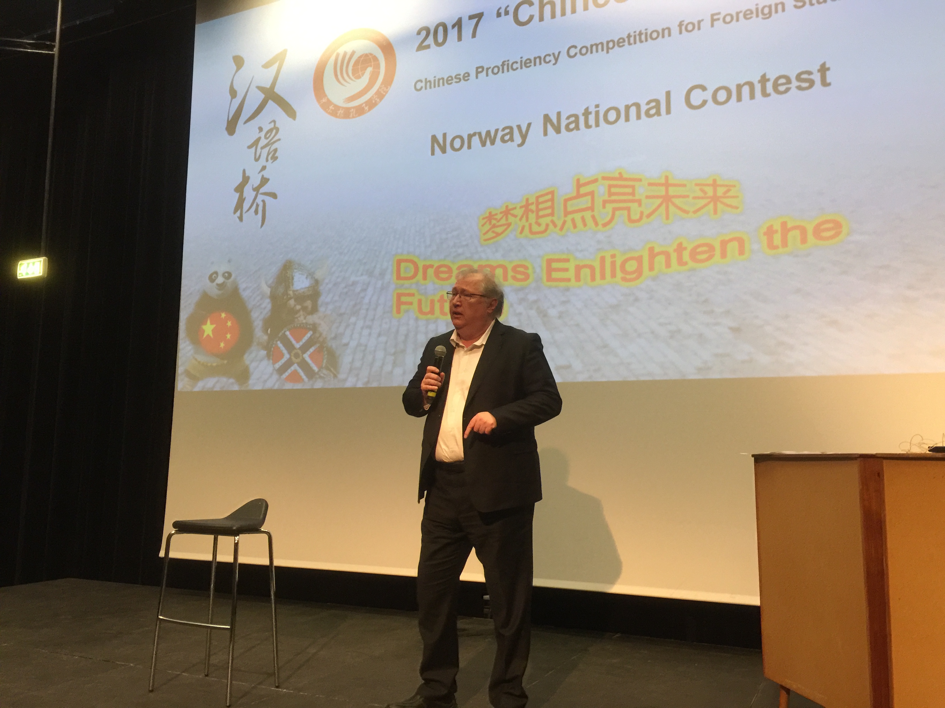 比赛开始前,驻挪威使馆教育处宣读了王民大使专门为本届比赛发来的贺信。王民大使在贺信中说,“值此2017年世界大中学生“汉语桥”比赛挪威赛区预赛开始之际,我谨代表中国驻挪威使馆向参加比赛的各位选手和指导老师表示热烈的祝贺!我希望在中挪关系实现正常化,挪威首相成功访华重启两国各领域务实合作,中挪关系进入新的发展篇章之际,广大挪威青少年在学习汉语的同时,能够积极推动中挪人文交流,增进中挪民众间的了解和友谊,为中挪双边关系的持续健康稳定发展做出你们的贡献。预祝2017年汉语桥挪威赛区比赛取得圆满成功!”