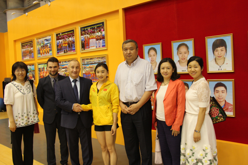 代表团来访期间,我校党委副书记、校长池建还带领其参观了我校网球馆、科研中心、国家队训练基地等场馆。代表团与2008年蹦床奥运冠军何雯娜合影留念。
