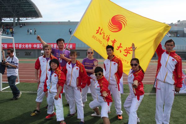 我校留学生积极参加教育部主办的首届“留动中国--在华留学生阳光运动文化之旅”全国比赛,我校参赛队员由来自奥地利、瑞典、伊朗、哈萨克斯坦、越南、马来西亚、加拿大、俄罗斯和塞舌尔九个国家留学生和艺术系、竞技体育学院两名中国学生联合组成,经过北京赛区初赛、内蒙古赛区选拔赛,最后代表北京市高校进入青岛总决赛。经过我校中外师生的共同努力,克服了排练时间短、任务急的困难,在全国总决赛28支队伍中,取得武术才艺比赛第二名,篮球三对三第六名,团体总分第八的好成绩,位居北京市各高校总分排名首位。并入选武术节目参加闭幕式颁奖晚会的演出。