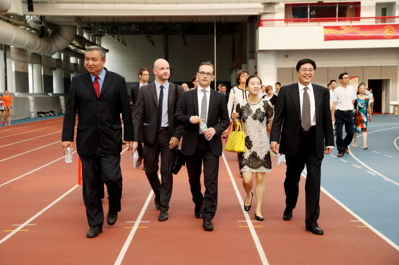 2015年7月6日,德国联邦司法和消费者保护部部长海科•马斯先生 (Heiko Maas)一行8人在我国国务院法制办公室主任宋大涵先生一行7人的陪同下访问我校。我校校长、党委副书记池建同志会见代表团一行并与其进行了亲切会谈。会谈中,池建校长向德方介绍我校基本情况和与德国学校合作的现状等,并表示希望德方的此次来访能够促进我校与德国优秀高校的交流合作,拓宽我校的交流渠道。海科•马斯部长还就现役运动员学生如何完成学业等问题与池建校长进行了交流。会谈结束后,池建校长带领来访代表团参观我校国家队训练基地,观看武术及艺术体操表演及国家蹦床队训练等。参加本次访问接待的还有外事处处长金晓平、副处长董梅、吴俊老师、孙晓老师,国际教育学院院长余学锋、副院长田青,武术学院院长张强强、朱宏老师,田径教研室副主任闫俊涛、体育艺术系隋剑爽老师等。