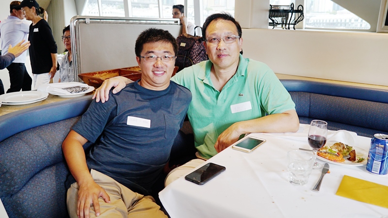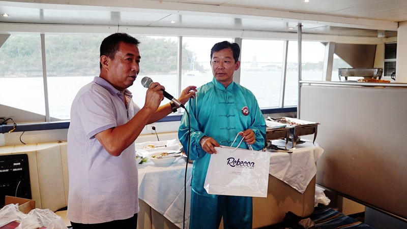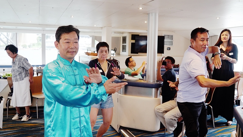自助午餐期间,80级武术系的校友韩劲松带着85级体育管理系的校友刘晓红一起表演太极拳以及健身气功。有人跟着一起“比划”,也有人练拳“拆台”,现场一片祥和又充满着欢声笑语,连游艇上的外国友人都不禁拍手叫好。