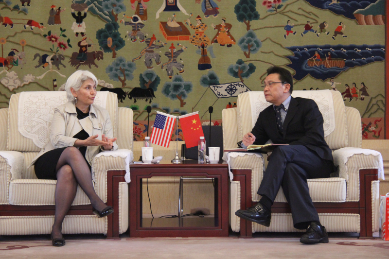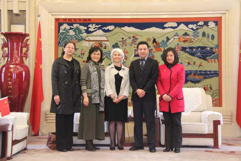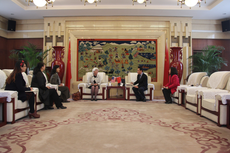 女士代表加利福尼亚州立大学来我校进行交流访问。我校外事处金晓平处长会见了外宾。双方就两校之间专家合作科研、各层次学生交流等问题进行了讨论。金晓平处长介绍了我校各类学生交流项目,表达了欢迎加州州立大学的学生早日能成为我校留学生的期望,同时鼓励外语系尽快与对方建立具体的合作项目。参与此次会谈的还有外事处董梅副处长和外语系田慧主任、戴旭副主任和刁艾莉老师。
